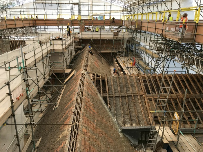 While I was there, the roof was being renewed. It was fascinating to take a tour and look down on the roof shrouded in a canopy of scaffolding and plastic sheeting. The red roof tiles were being carefully removed and replaced one by one.