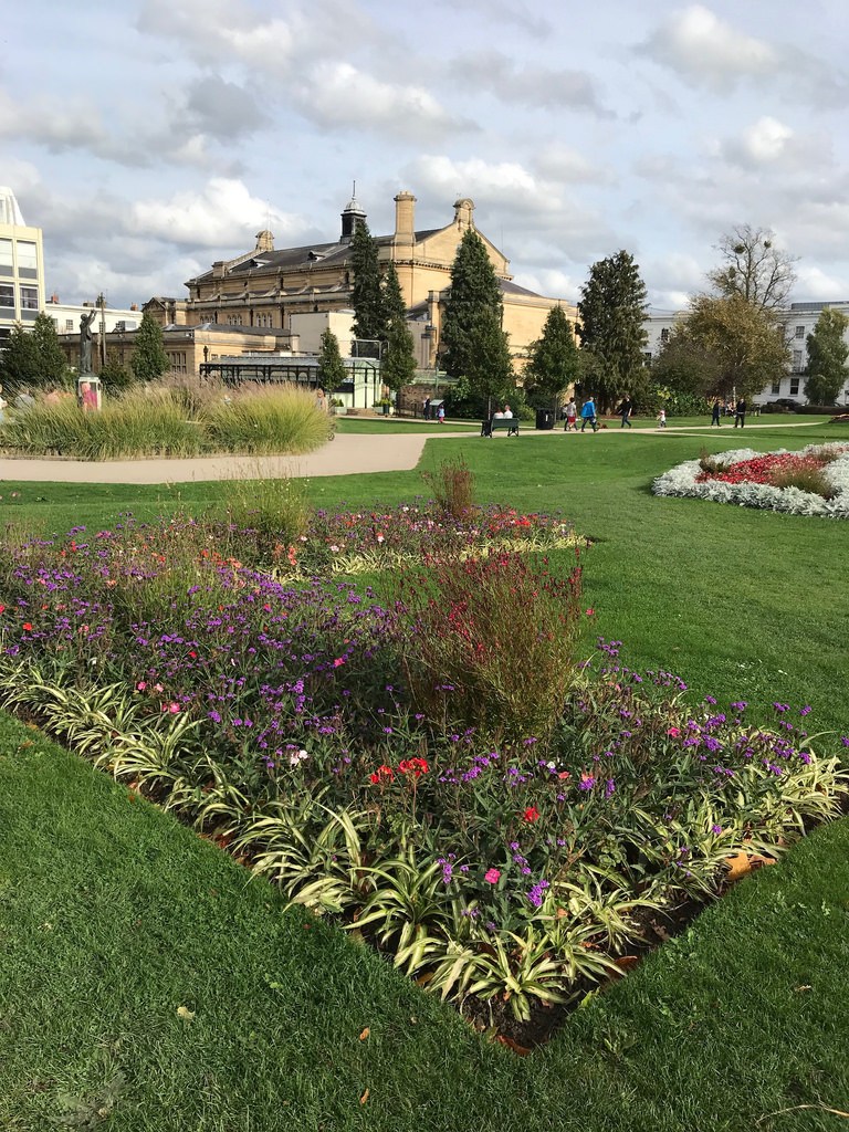 My wanderings around the centre of Cheltenham, photographing all the pretty Regency buildings brought me to the Imperial Gardens, a park with pretty floral beds behind the town hall. Where the nearby Queens Hotel now stands was once the Sherborne Spa and these gardens were laid out for the exclusive use of its guests. Now the park is a place to relax on the open lawns and admire the colourful bedding displays that change with the seasons.