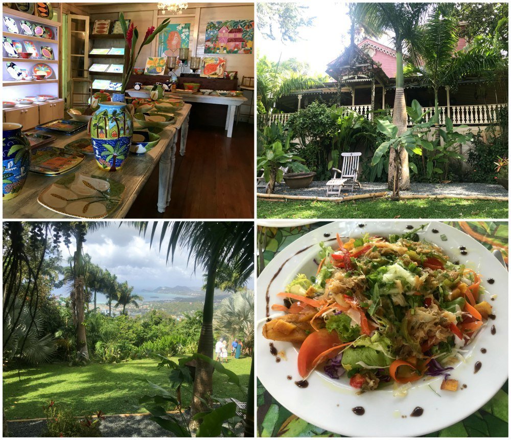 I really enjoyed my Pink House Salad, with avocado, tomato and cucumber, topped with caramelised plantain and salt fish, a typical St Lucian ingredient. After lunch I wandered around the gallery next door. Here the colourful pottery bowls and dishes created by owner Michelle Elliot were on display. I also saw printed cloth table mats and naive style paintings of St Lucia scenes.
