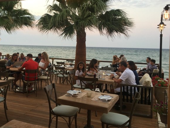 As guests start to arrive in the restaurant the sun casts a golden glow over Anadalis and the sea breeze rustles the leaves of the palm trees. You’ll find casual bleached wood tables and painted wood sofas. The sea is lapping gently over the shingle and narrow strip of sand where guests swim during the day.