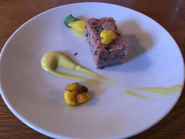 First we were offered a pre-starter – a tiny terrine of ham hock speckled with green herbs, garnished by tiny pickled vegetables and a sweep of mustard sauce to wake up the taste buds. It was delicious and made me wonder if I’d still have room for that starter I’d ordered!