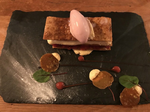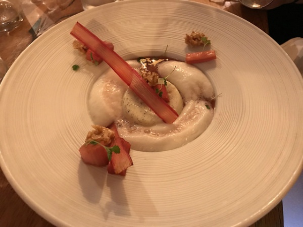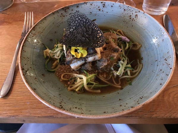 For the main course my pan fried cod with quinoa, bacon dashi and courgette spaghetti came beautifully presented. The cod fillet resting on top of the sauces and vegetables was nicely cooked, with large flakes of fish, the courgettes making a pretty green contrast, some yellow pansies for a bit of colour and a mysterious black wafer to top it all. The bacon dashi sauce was dark and salty stock, giving the whole quite an oriental flavour that I found quite strong, although it was probably what I should have expected being made with bacon.