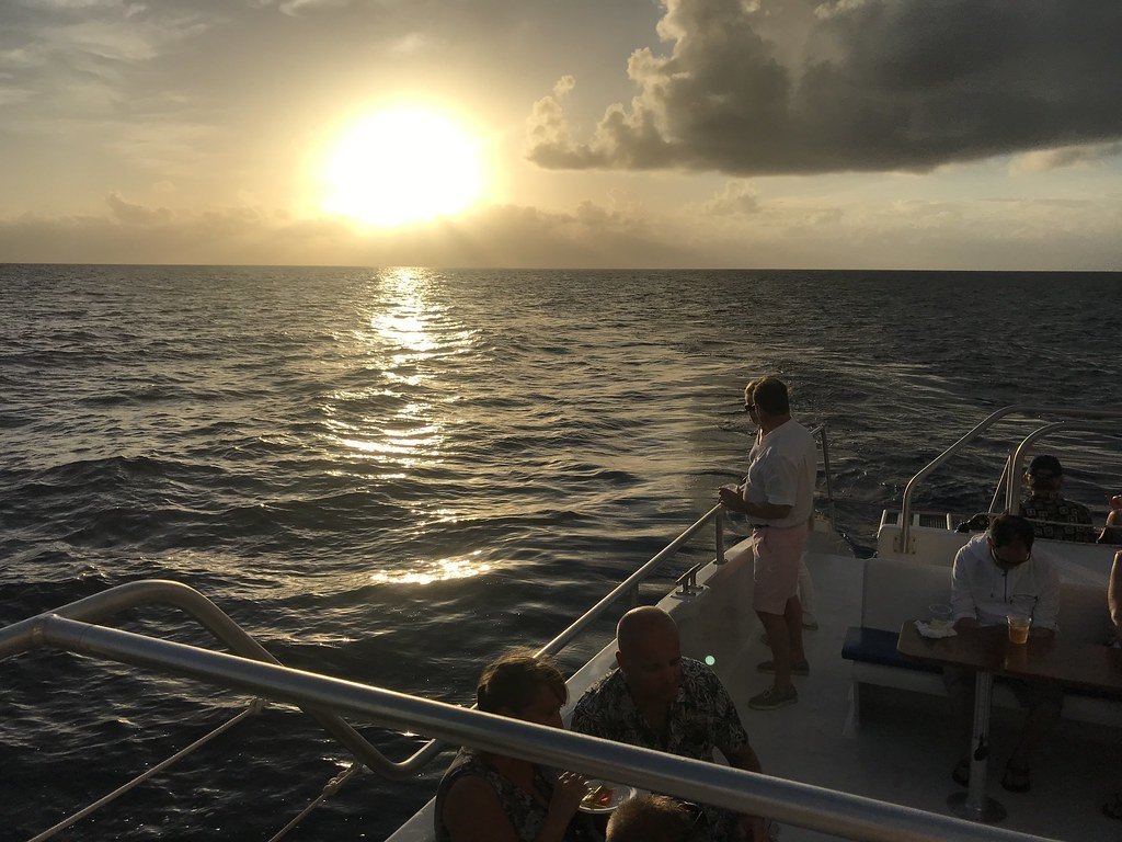 On our evening cruise, the clouds on the horizon created a hazy sunset glow as the sun slipped below the Caribbean sea in a golden ball. But, sadly no fireworks of red and orange on that evening!