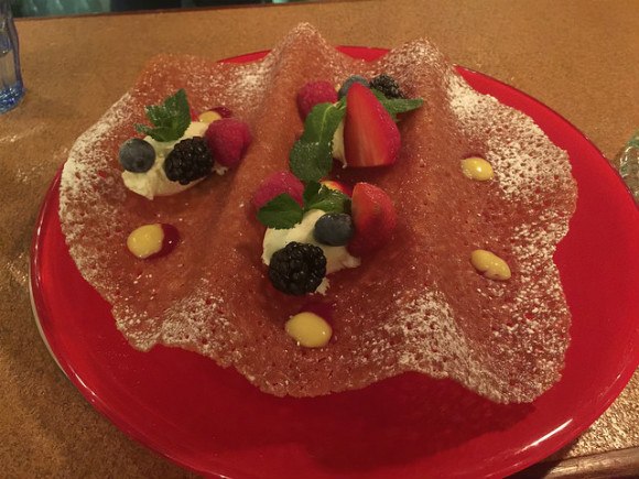 The roast hake was perfectly cooked, balanced on top of a broth with vegetables and new potatoes. I should have known better than to order the floating brandy snap for dessert.