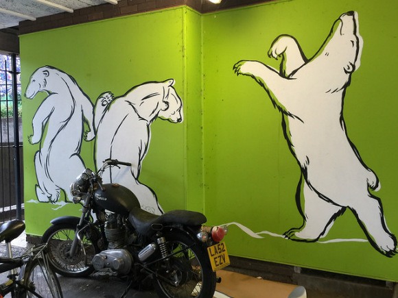 We discover that our guide Tina Altwegg is also an illustrator and artist, as she shows us her Dancing Polar Bear mural. It’s located in the underground cycle park of Hamilton House, where she has her artist’s studio.