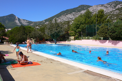 The big bonus of the campsite was that it has a very nice swimming pool – even some of the larger campsites I looked at didn’t have a pool although they were right on the beach. The pool was policed by a gorgeous lifeguard who was deeply tanned and sported a different bikini every day, although it shut after lunch when everyone went to have their afternoon siesta. Right by the pool is a basketball and tennis court but it felt too hot to have a serious game. There is also a cafe, restaurant and small shop on site and the pizzas were freshly made in the pizza oven to eat in or take away. The site is shaded by many pine trees which was a big bonus in the summer heat.