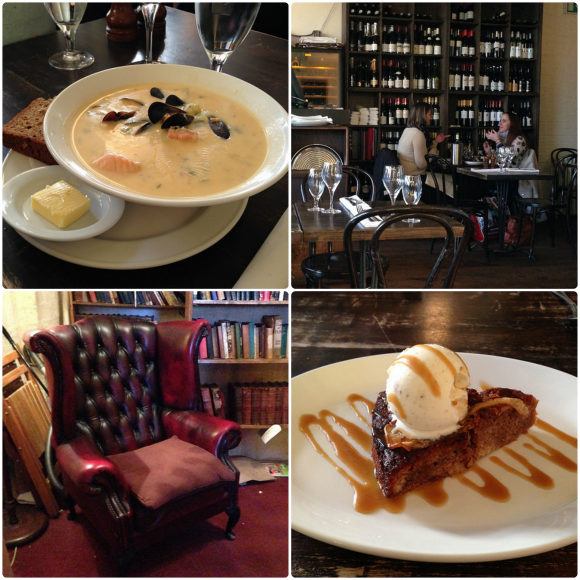 I had the sole, nicely browned in butter with tiny pink Dublin bay prawns, balanced on a pile of mashed potatoes with cabbage and doused in a lovely caper and butter sauce. Despite the casual wooden table and bentwood chairs, this felt like a proper restaurant with stiff white napkins and an excellent choice of wine by the glass, written on the board on the wall.
