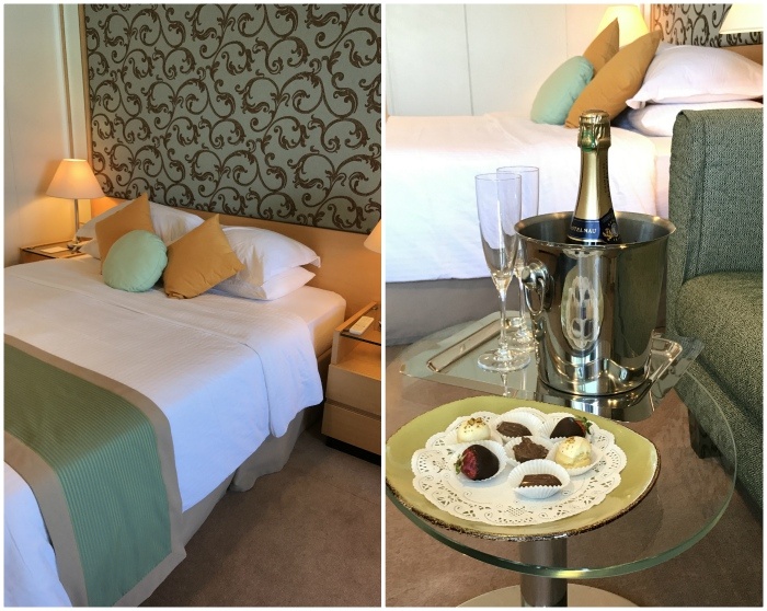 Our bathroom had marble effect tiles and flooring with a large sink area and walk in shower. There were plenty of delicious Molton Brown toiletries to spoil us too. Storage was plentiful in the double wardrobe and drawers, with space for our cases under the beds and a fridge to keep drinks cool.