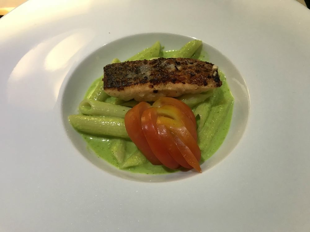It was mesmerising to watch Chef Harry’s skill as he made a sauce with sautéed onion and garlic. He added lemon juice, fish stock, nutmeg and cream and then the lettuce in the blender. This made a creamy and vibrant green sauce to accompany the pan-fried barracuda.