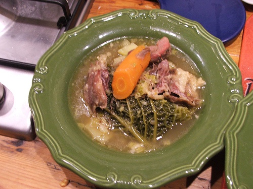 The specific ingredients vary depending on where you go to eat. It was traditionally made by peasants who used whatever ingredients were available at the time – cabbage and pork are usually two mainstays.