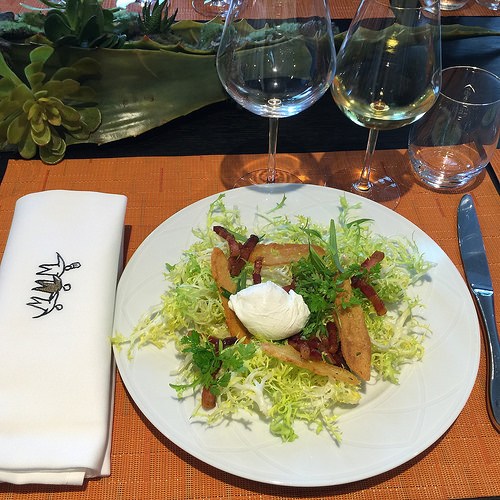 Under Philippe’s culinary direction, we were encouraged to have a go at stirring, whisking and poaching the perfect egg for the Salad Lyonnaise. Of course we got away without having to do any of the washing up! At the end of the demonstration, we sat down to a delicious meal of Burgundy specialties, although we could barely take any credit for it.