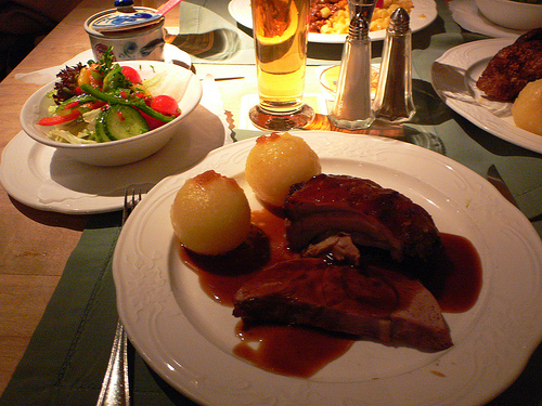 At Haxnbauer that means large hunks of meat, slowly roasted on a spit, slabs of pork served with rib sticking potato dumplings. You’ll find only the token lettuce leaf in the way of garnish.