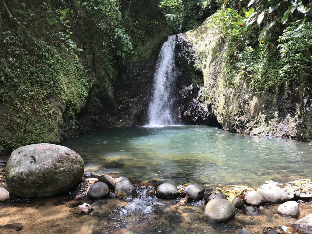 Like the Seven Sisters waterfall, the water cascaded over the rock into a pool. The pool was deep enough to stand and have a little swim in, with a Grenadian flag pinned up behind the waterfall.