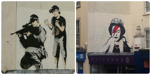 It’s practically impossible to mention street art in Bristol without Banksy coming up in conversation. It’s a good few years since Banksy and his Bristol street art contemporaries were out and about in Bristol putting up murals which the Bristol City Council was just as quick to clean up and paint over . These days a council lucky enough to find a Banksy popping up on its streets is more likely to cover it over with Plexiglass to avoid anyone vandalising it. In 2009 Bristol’s favourite street artist held a free Banksy art exhibition in the Bristol City Museum and the queues to get in snaked around the block, as fans flew in from all over the world, to take the rare opportunity of seeing fresh work from Banksy. These days there aren’t too many Banksy murals left in Bristol, so take the opportunity while you can to see an early Banksy – The Mild Mild West above The Canteen in Hamilton House on Stokes Croft (always crowded for the affordable food and live music). There’s also the naked man hanging from the window towards the bottom of Park Street, but the Police Marksman on Park Row has unfortunately been painted over with a mural of the Queen.