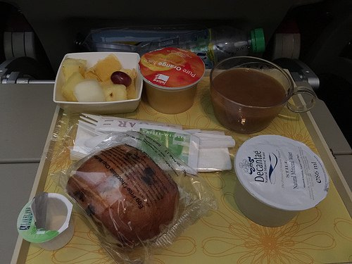 By the time the breakfast tray comes round my bottom has fallen asleep and my legs are compressed. I tuck into the sweet muffin and fruit salad to pass the time before stretching my legs on a wander up the aisle.