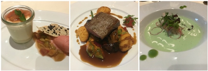 From the Theo’s restaurant set menu I ordered a cucumber and yoghurt chilled soup with smoked salmon tartar. Then a main course of Walser lamb saddle with braised bean cassoulet and pomme dauphine.