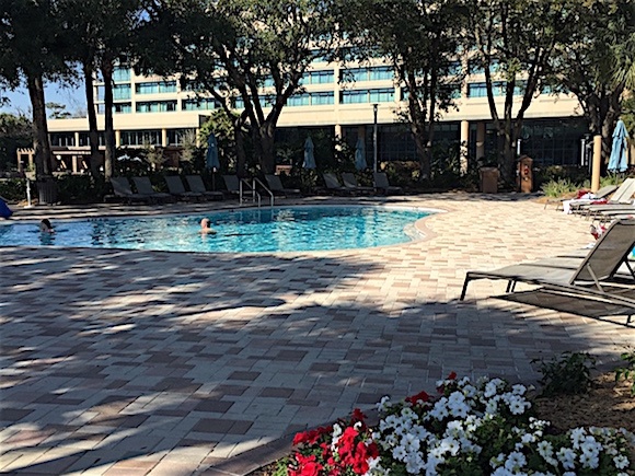 We strolled around the edges of the lake bordered by cozy villas nestled among lush plantings, where a gazebo provided a wide view of the main hotel building. Crossing the lake bridge, we approached an expansive outdoor deck. After a drink from the outdoor bar we settled in to watch ducks paddle around a waterfall in the distance. Signs indicated the possibility of an alligator sighting, but we were not so lucky. This seemed the perfect Florida setting, with gentle breezes, bright blue sky and Spanish moss-draped live oak trees.