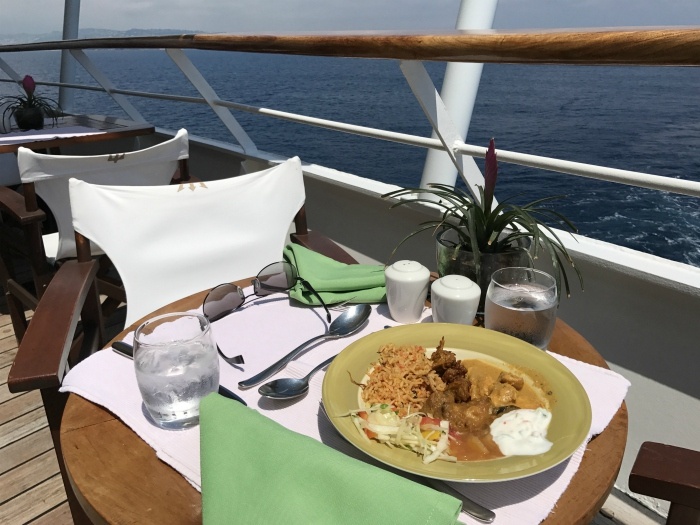 On our day at sea there was a spicy selection of delicious curries on the buffet. On other evenings we always enjoyed the menu choices, with everything beautifully presented. I swear they must have someone in the kitchen who just spends all their time carving fruit into pretty table decorations and containers!