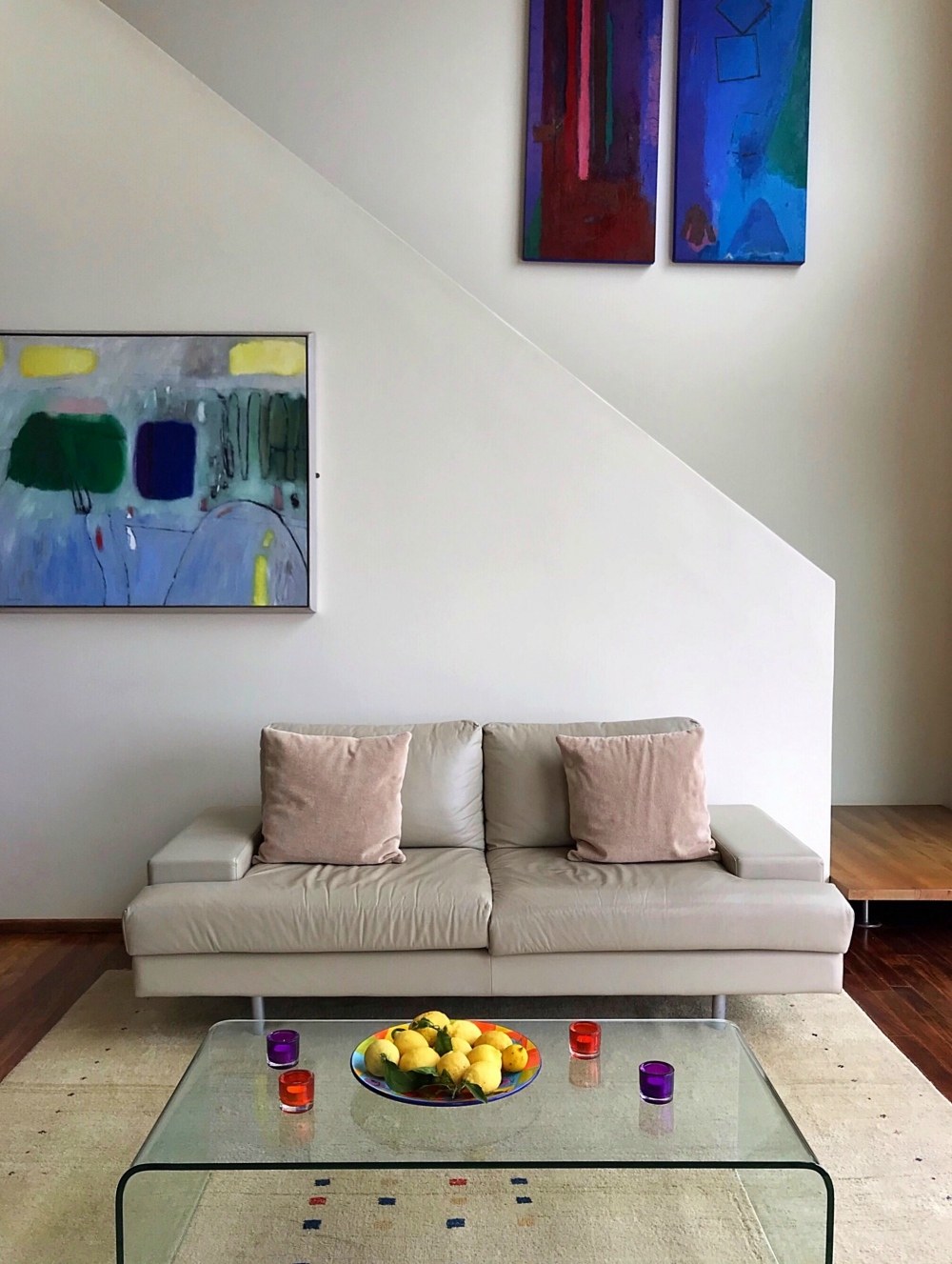 It’s about the small details and the carefully chosen abstract artworks that inject a burst of colour into the pale spaces. The design highlights a play of lines and shadows as the light changes throughout the day.