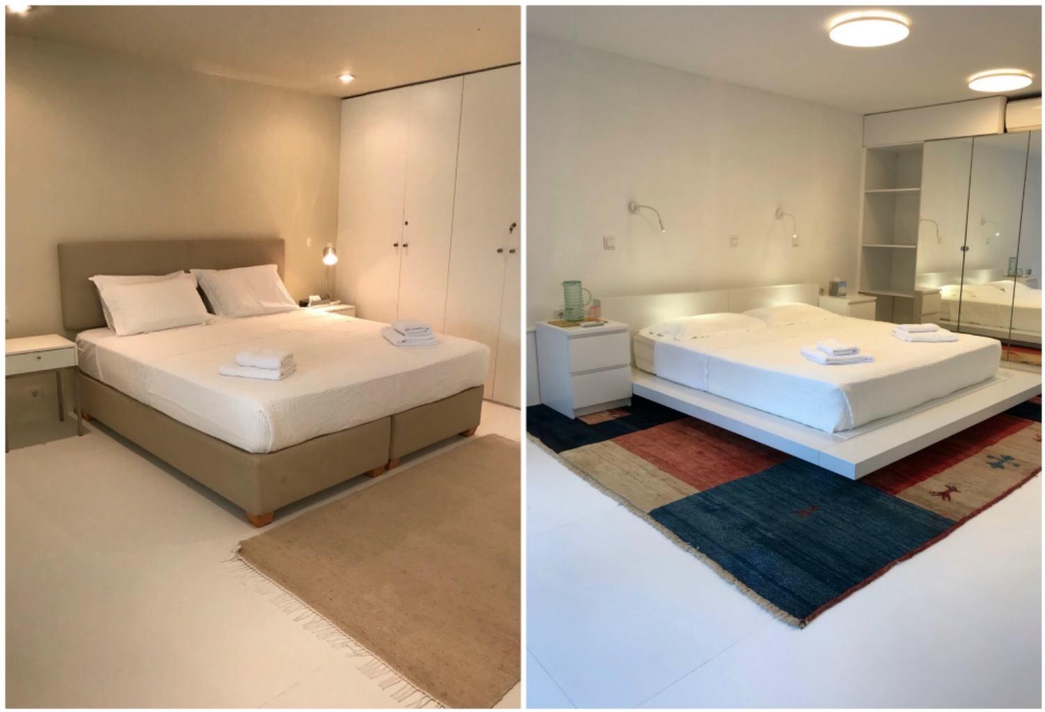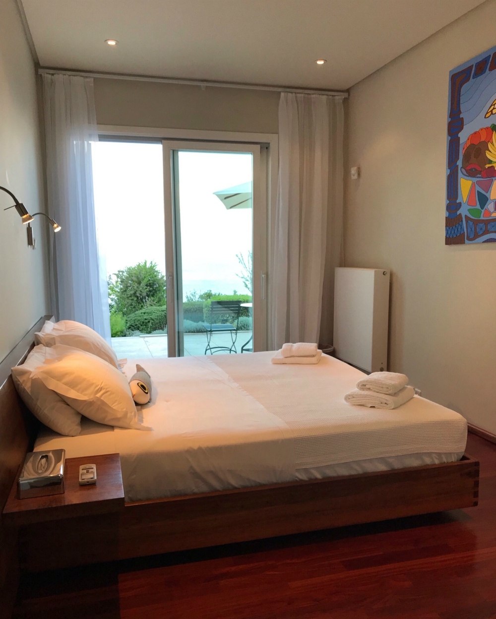 On the ground floor is the Gaios master suite, with glass doors out to the terrace and an open bathroom with enormous bath as well as a private shower room. Like all the rooms of the villa, the style is understated luxury, with hardwood floors and minimalist furnishings, offset by splashes of colour in the rugs and artworks from the owner’s collection.