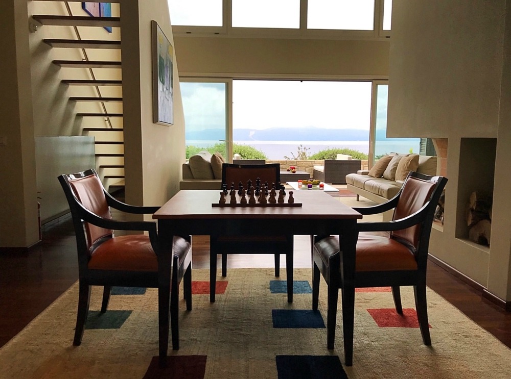 Light pours into the villa from the enormous double height windows and fills the entire house, with relaxed modern sofas, a kitchen to one side and a cosy area at the back with a games table and drinks cabinet.