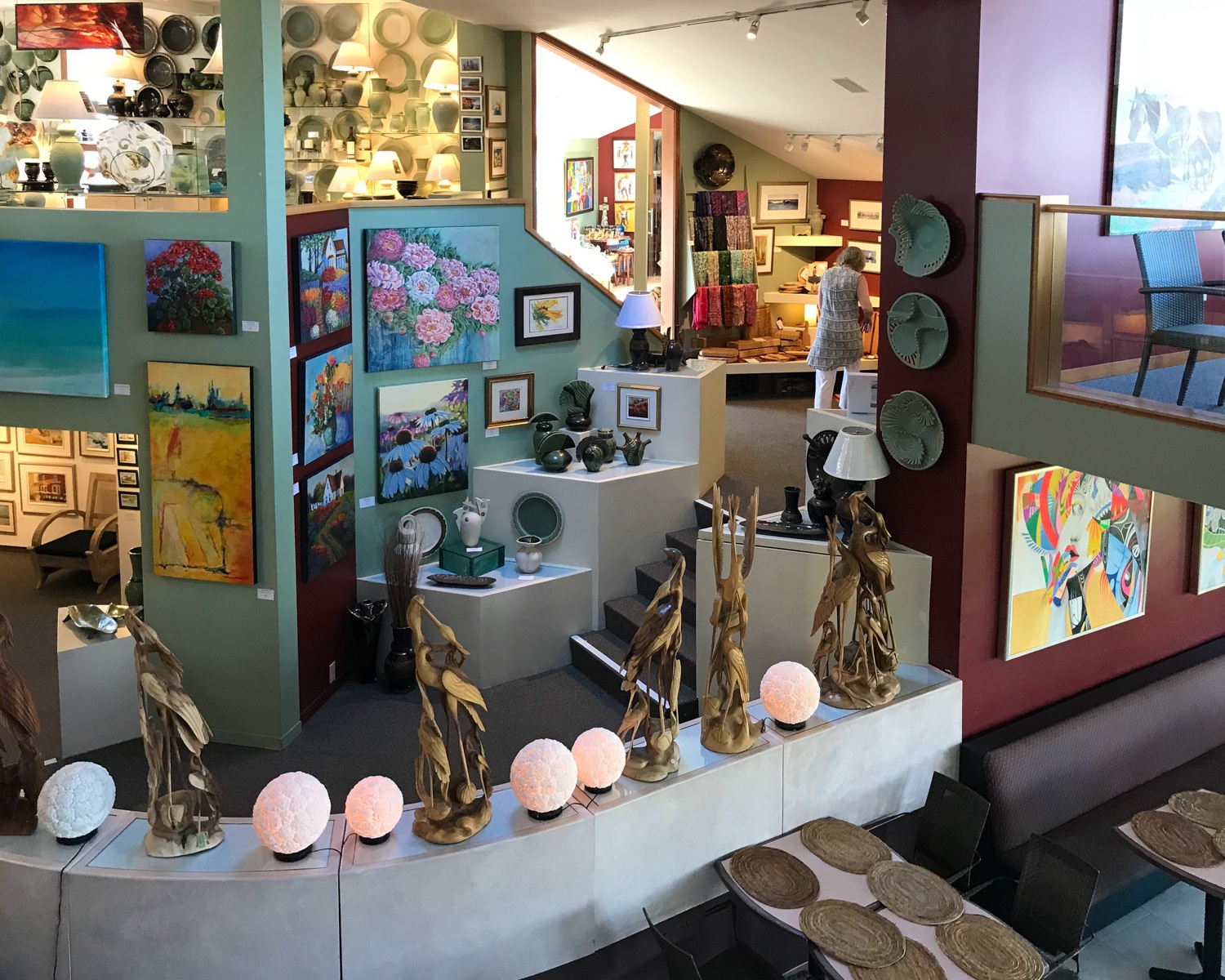 The gallery features the pottery of owners Peter and Joel as well as supporting local artists. Colourful paintings and prints of over 50 artizans are on display.