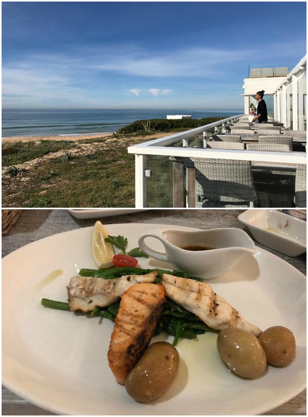 We stopped by the beach at Vale do Lobo, the resort that adjoins Quinta do Lago, part of the area of three resorts including Almancil known as the Golden triangle. This is a beautiful stretch of golden sand with beach bars and restaurants like Maria’s which we spotted set back from the sea shore. We returned there later for dinner in the sea themed restaurant, that keeps the ocean theme going with bleached wood tables, wicker chairs and soft turquoise blue furnishings. The menu is upscale bistro, with lots of seafood and I enjoyed my trio of fish, served with new potatoes and a Mediterranean sauce.