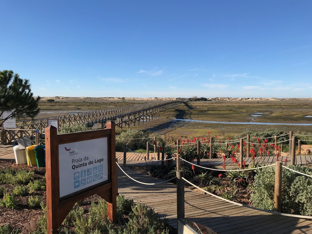The path for the lake is just a 5 minute walk from Quinta do Lago Country Club at the end of the access road and from here the path continued alongside the marshland and river bed which is exposed at low tide. The Ria Formosa Nature Reserve is a haven for birds and also we saw locals collecting razor clams in the mud. The path leads along a boardwalk to the parking area for the beach Praia da Quinta do Lago and then a wooden bridge takes you across the river bed to reach the sand dunes and beach beyond. It was magical in the early morning, watching the reflections of the water and the birds from the bridge, or pausing in the sand dunes to enjoy the sound of the ocean and the waves breaking on the beach.