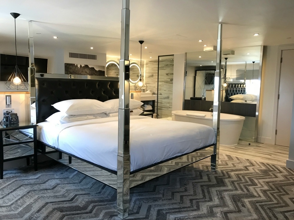 Once our room was ready we headed up to the 5th floor to find our room overlooking the gardens. Walking into our Loft Suite (Room 505) was one of those jaw dropping hotel moments when you think – is this all for me? But then of course, if someone has to play at being a Hollywood movie star, it may as well be you! The Loft Suite is the epitome of modern glamour and the mirrors and black, white and grey theme made me think it might have some 1930’s art decor inspiration.
