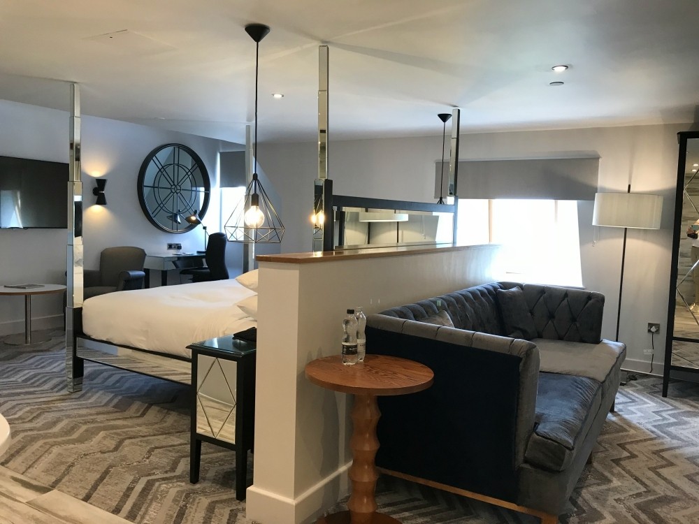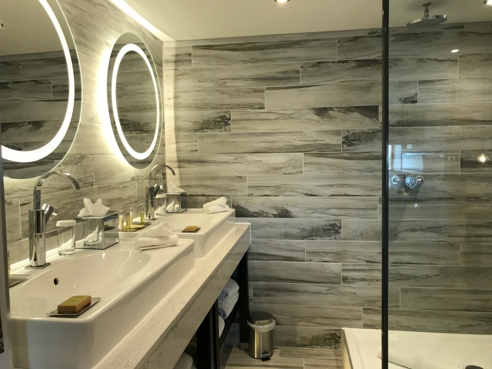 This is very much a romantic couple’s room, with the king size mirrored four poster placed centre stage and the open style of bathroom with freestanding bath tub, walk in shower and ‘his & hers’ sinks. The loo was behind a closed door but this open style of bathroom would be perfect for a couple, although a bit too intimate for anyone else! The room had ‘celebration’ written all over of it, and I imagine it’s often booked for a wedding night, special birthday or landmark anniversary.