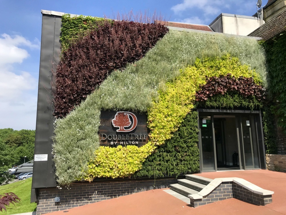 The hotel’s main entrance is through a striking modern box with huge windows letting in the light, softened on one side by a living wall of different coloured foliage. Entering the reception we were offered the famous Double tree cookies which we quickly ate leaving only a light scattering of crumbs!