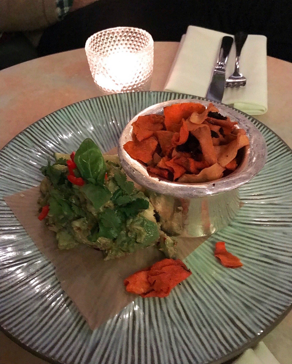 As we were getting quite hungry I ordered one of the small plates to go with our drinks instead of waiting for a starter; an avocado and chilli dip with Taro chips which was delicious and ideal for sharing with our drinks.