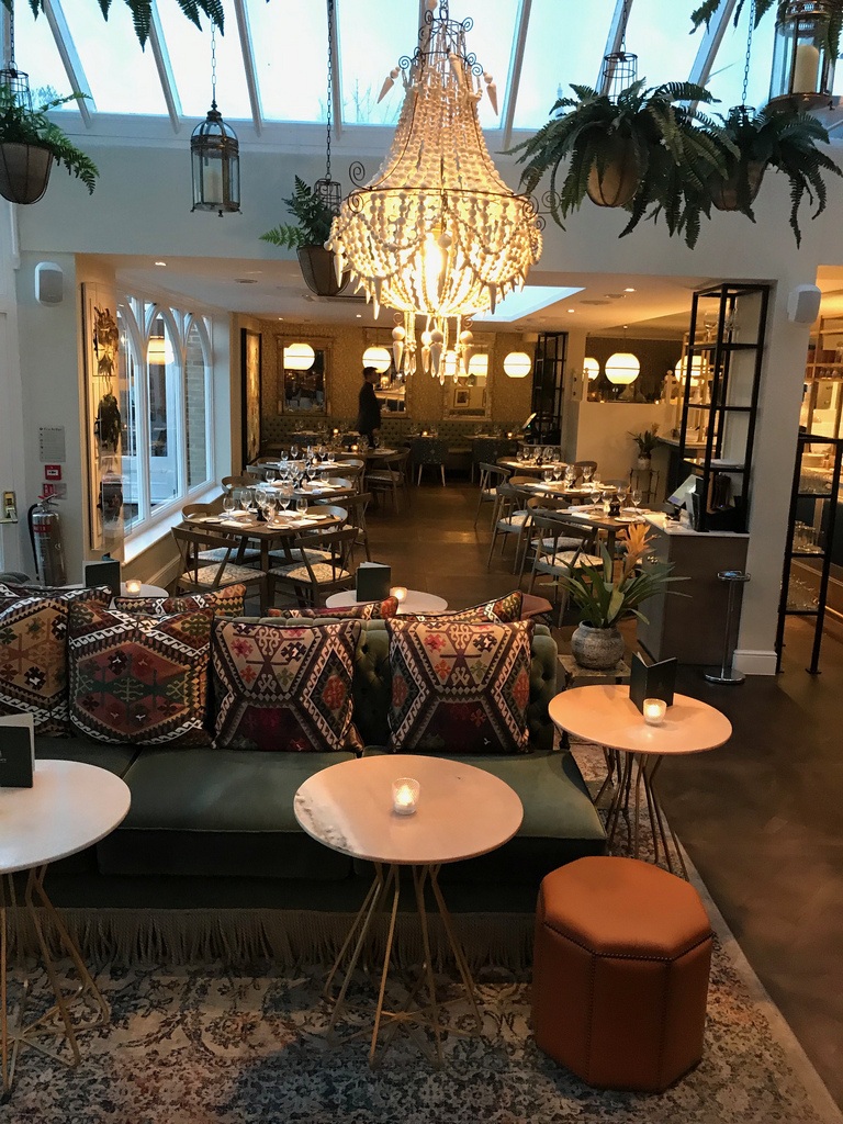 Walking up the steps of the hotel entrance with its imposing Georgian columns, we entered the marble floored lobby. The elegant fireplace and classical busts were just as you might hope to find in a country house, while the table was covered with the leafy ferns that are found in Richmond Park and a tree branch seemed to be growing from the ceiling.