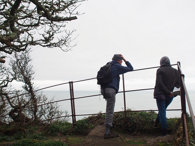 At the look-out point above Mouth Mill Cove we stood on the balcony of the beautiful wooden summerhouse overlooking the beach with large grey boulders and stones and gazed over the rugged cliffs and wild sea views.