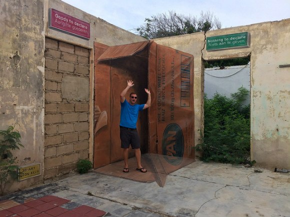 Next on board with the project was Leon Keer of the Netherlands who is known for his surrealist pieces. In a disused building next to the old customs house, he painted the 3D cardboard ‘Pan’ box. This is a representation of a well known brand of corn meal from nearby Venezuela.