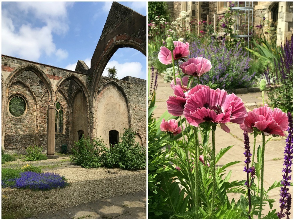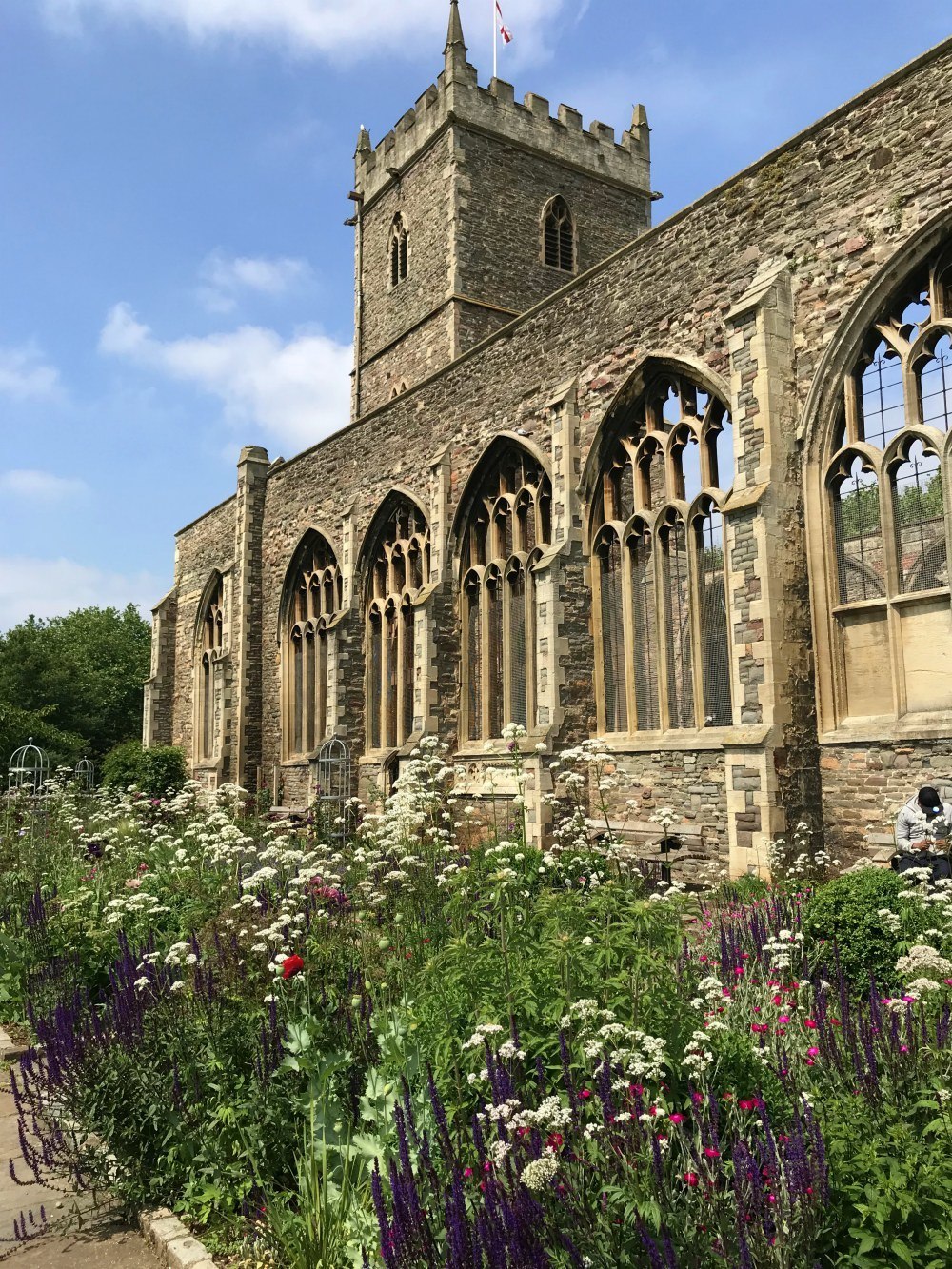 Behind the church are stone sculptures as part of a water feature. Running along one side is a Physic garden, modelled on the medieval gardens that would be packed with herbs and medicinal plants used in cooking and healing.