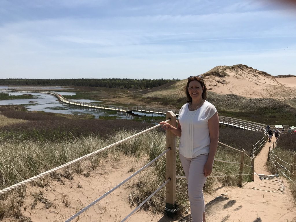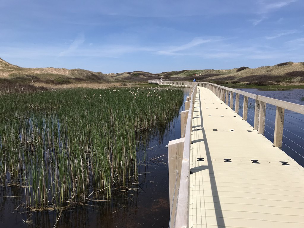 Our walk along the Greenwich Dunes Trail was one of the favourite memories from our trip. We walked across the pond on a meandering boardwalk towards the sand dunes. The first part of the hike took us on a flat path through farmland, until we reached an area of woodland where the boardwalk started.