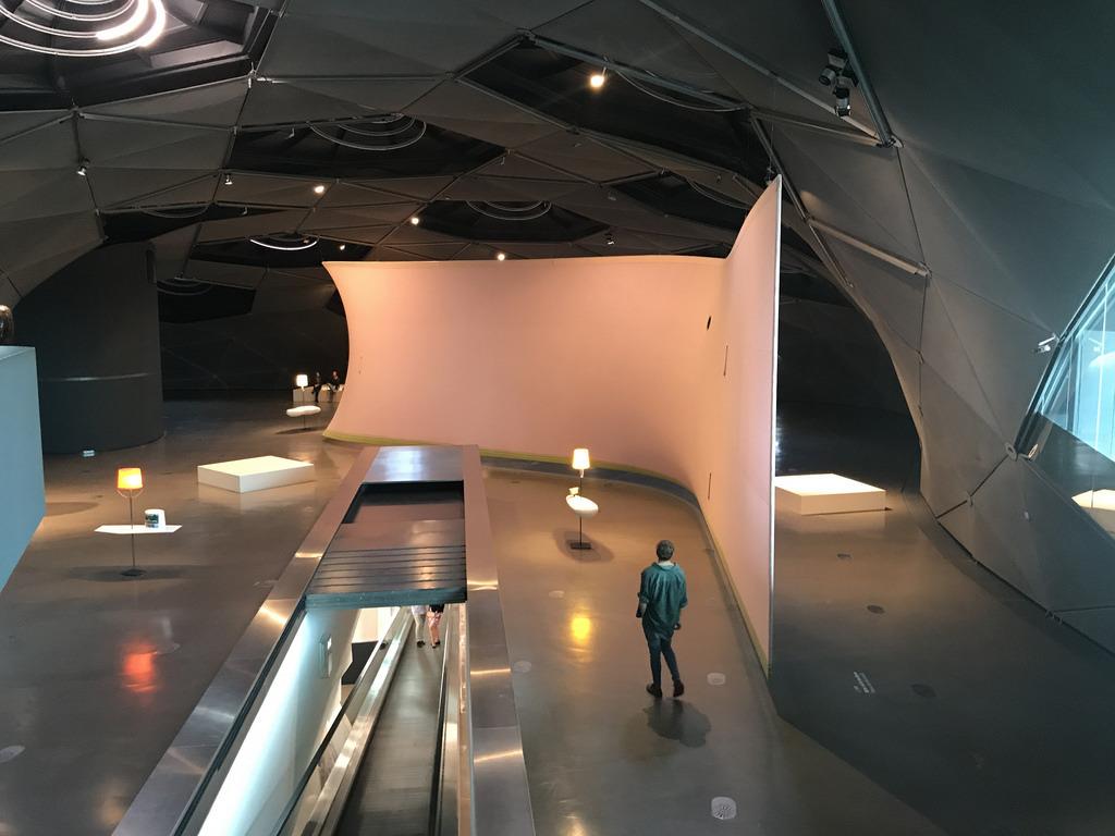 The building is a sculpture in its own right, with a pattern of metal panels and rings around the nozzles that let in light. The open gallery space when we visited was filled with lamps made from upturned paint buckets on top of sculptures like ironing boards. A performer was periodically throwing words out into the open space.