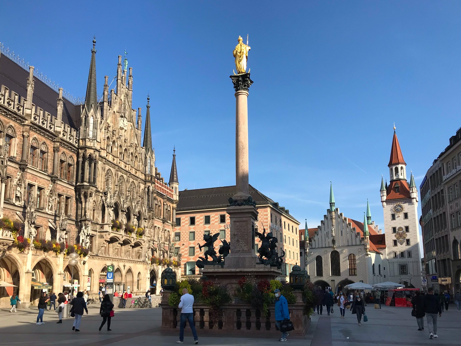 Marienplatz is the tourist hub of Munich, with pavement cafes for people watching, guided tours passing through, street musicians striking up a tune. A grain market and tournaments were held here in the Middle Ages and a Christmas Market has taken place here for centuries.