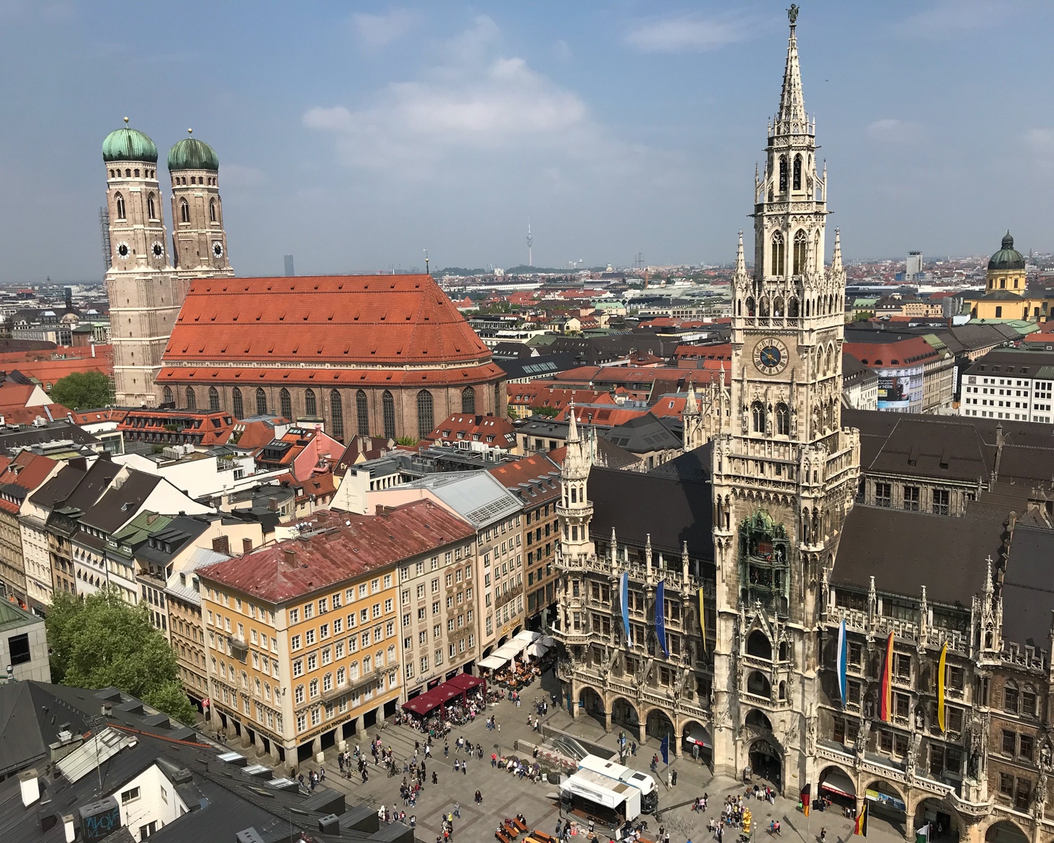 Climb up to enjoy panoramic views over Marienplatz, the gigantic twin towered Frauenkirche church and the red roofs of the old town.
