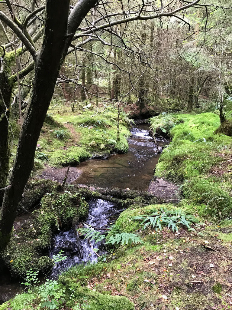 We were heading into St Gwynno’s forest which was planted after the Second World War and has now matured to become an important habitat for flora and fauna, as well as a popular area for walking and mountain-biking. We followed a path of sorts that only Jill could discern, weaving through the conifers mixed in with other moisture loving trees like larch and willow. Underfoot was a spongy carpet of needles with red toadstools springing through them and from time to time we had to jump the shallow streams fringed with ferns.