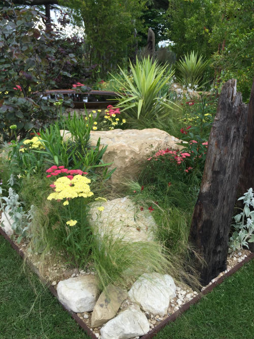 In the Oregon garden it was all about the mountain landscape with rocky outcrops and mountain streams backed by pine forests (or as much of a forest as you can realistically transport and plant at a garden show). There were a few vines too to show that they are a wine growing region and at the front a naturalistic planting of daisies and grasses looking as if they might be growing in the border of some farmer’s field. To represent the many cycling routes around the state, the edge of the borders were decorated with bicycle wheels.